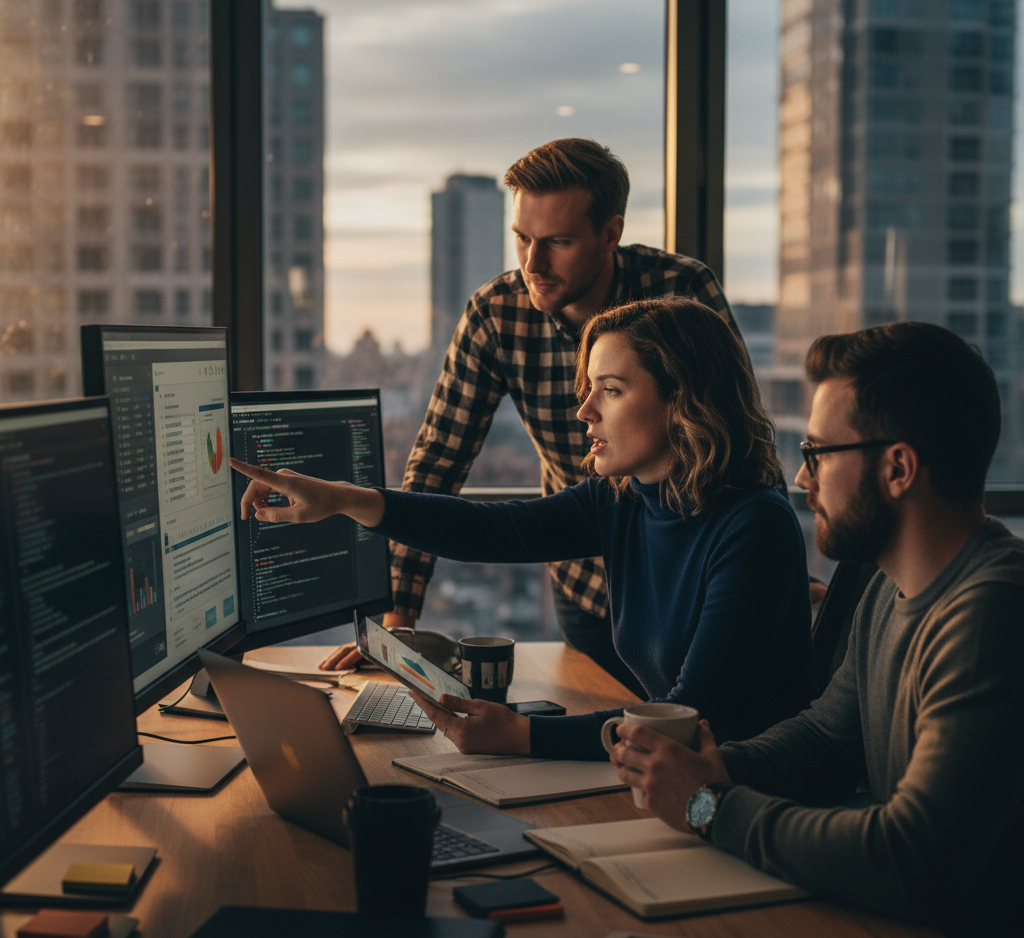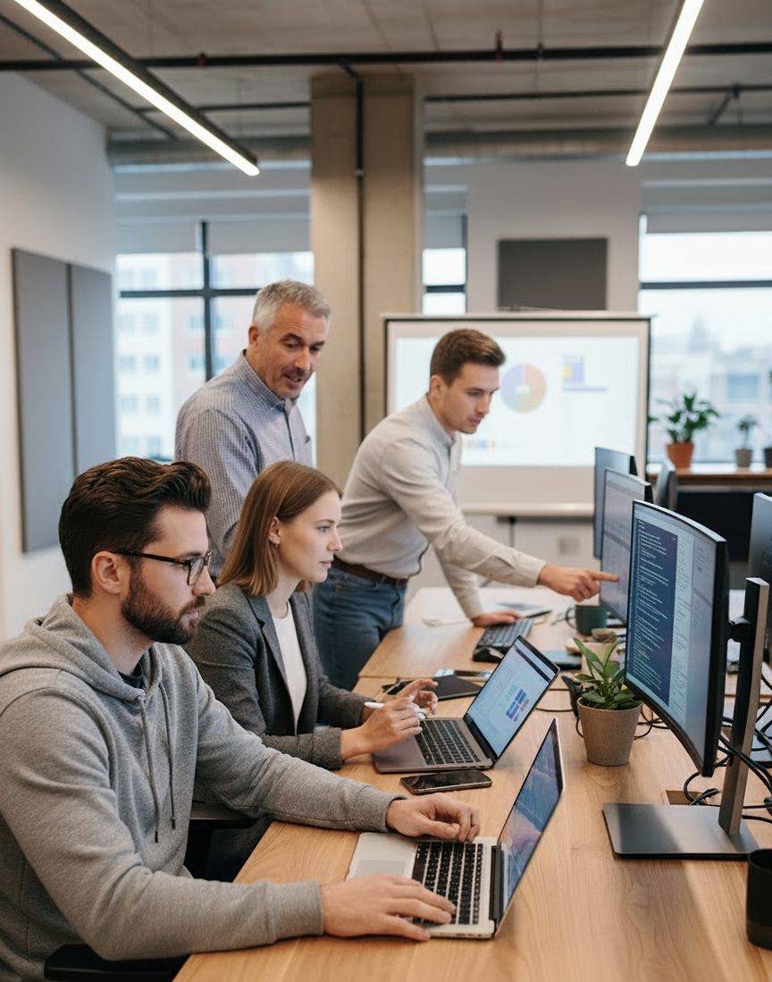 Od pierwszej analizy aż po rozwój i utrzymanie – wspieramy Cię na każdym etapie i doradzamy w kluczowych momentach. Łączymy technologiczną ekspertyzę z biznesowym zrozumieniem, tworząc rozwiązania, które nie tylko działają, ale rozwijają się razem z Twoją firmą.